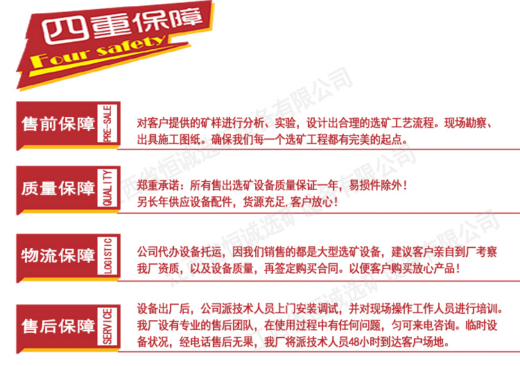 江西省恒誠選礦設(shè)備有限公司專注砂金選礦設(shè)備數(shù)十年,有著多年的金礦選礦經(jīng)驗,真誠為您在選金路上指引正確的思路.如果有任何疑問可直接與我們?nèi)〉寐?lián)系,我們將竭誠為您服務(wù).我廠所有設(shè)備質(zhì)保一年,購買我廠設(shè)備均享受四重保障:售前\質(zhì)量\物流\售后